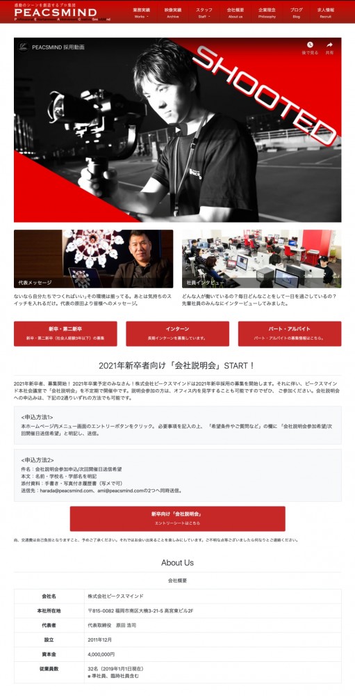 福岡を中心に全国で映像制作や結婚式場・イベントの演出をされている株式会社ピークスマインド様のホームページを制作させて頂きました。映像アーカイブやスタッフ紹介、ブログなどを充実させてたいというご要望でしたので、CMSも導入して頂きました。