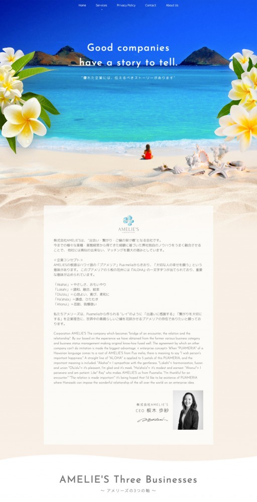 福岡を中心に企業や病院などのブランディングや業務改善のコンサルティングを行なっている株式会社AMELIE'S様よりホームページ制作のご依頼を頂きました。ランディングページのような1ページで全てを伝えるホームページが欲しいということでしたので、ヒアリングさせて頂き、制作いたしました。