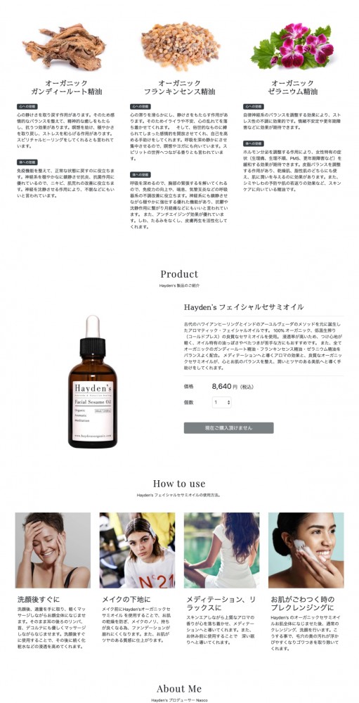 フェイシャルセサミオイルを企画・販売されているHayden’s Organic様より日本向けのネットショップ制作をご依頼頂きました。「すでにいらっしゃるファンの方向けのネットショップが欲しい。」ということで、シンプルなネットショップを制作しました。